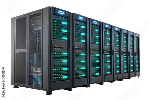 High-tech server rack in modern office efficient data management & led lights, isolated on transparent or white background