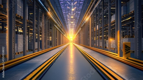 High-tech warehouse in China with blockchain data flows and secure trade connections.