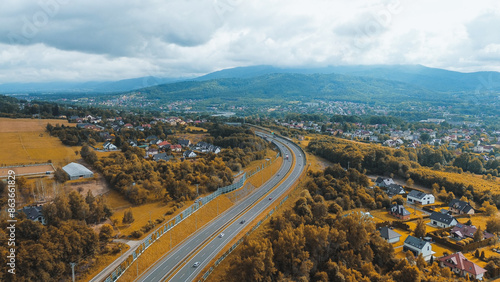 Highway through rural landscape with hills and mountains
