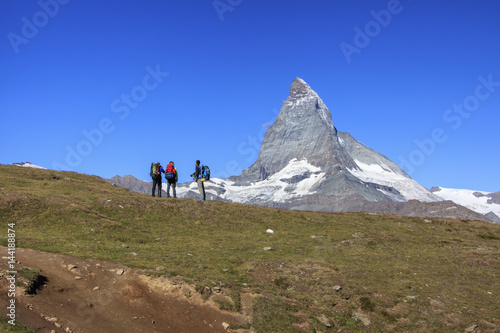 Hikers and photographers admire the Matterhorn in a clear summer day Gornergrat Canton of Valais Switzerland Europe