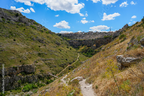 Hiking trail through dramatic Gravina gorge in Matera Italy
