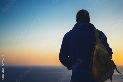 Hipster hiker tourist looking of amazing seascape sunset on background sea, guy enjoying ocean horizon, panoramic sunrise, traveler relax holiday concept, sunlight view in trip vacation