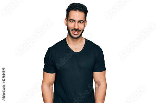 Hispanic man with beard wearing casual black t shirt with a happy and cool smile on face. lucky person.