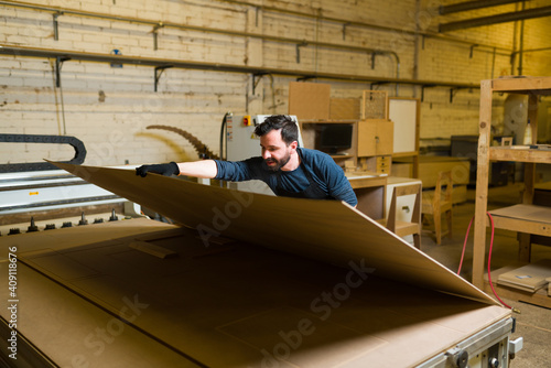 Hispanic man working on the construction of plywood furniture