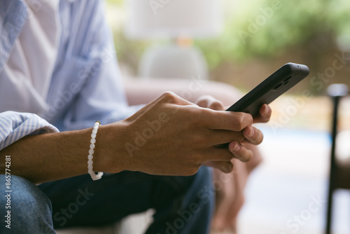 Holding smartphone, teenage boy texting while sitting on couch at home