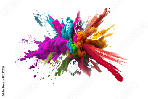 Holi color powder explosion with rainbow on isolated white background, burst of vibrant colors. Generative AI