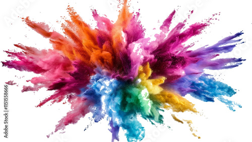 Holi colors splash powder. Explosion of colored powder, isolated on transparent background. Rainbow colored powder bursts on a white backdrop, holi festival celebrations