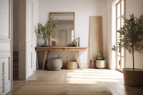 Holiday farmhouse entrance. White wall nearby, wood console table. Mockup of an interior