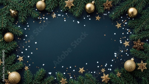 Holiday frame featuring opulent baubles, evergreen sprigs, and sparkles against a dark surface. Greeting card layout, banner example. Flat lay perspective, space for message.