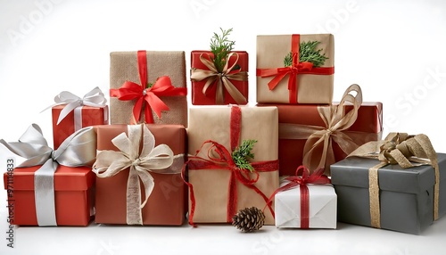 Holiday Gift Scene - collection of hyper realistic Christmas gifts showing a variety of wrapping styles, including classic red and green themes, silver and gold accents. Graphic art illustration