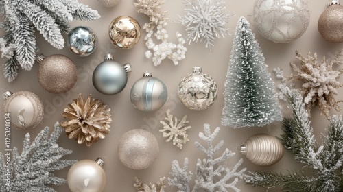 Holiday spirit with a top-down view of sparkling tree ornaments, baubles, sequins, and frosted fir branches on a muted beige surface