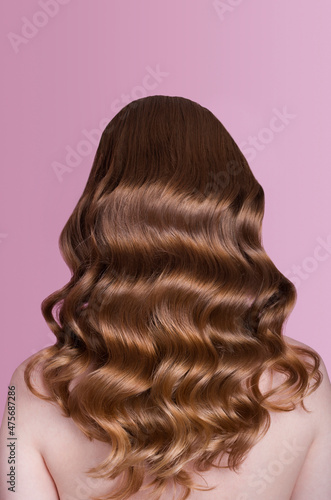 Hollywood wave styling on long beautiful red hair, back side view of red-haired young lady with long hair isolated on pink background