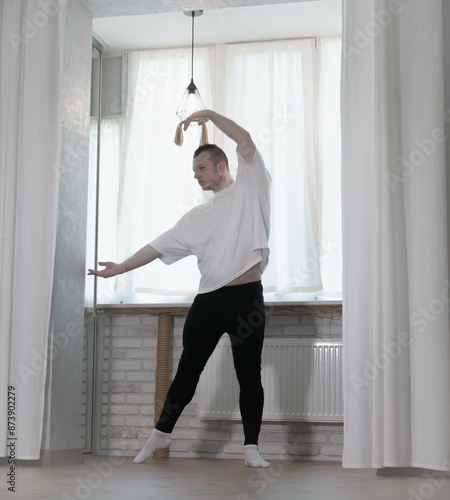 Home yoga pose workouts. A man performs sports exercises with his legs and arms. Male athlete stretches.