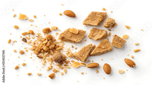 Homemade almond brittle pieces scattered isolated on white background show their crunchy texture and golden caramel color in a sweet dessert treat