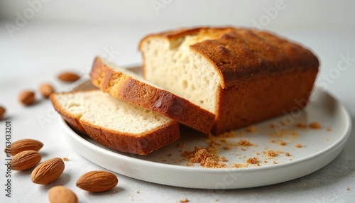 Homemade almond flour bread sits on a white plate with sliced pieces. Whole almonds surround the baked loaf. This gluten free treat is perfect for healthy eating.