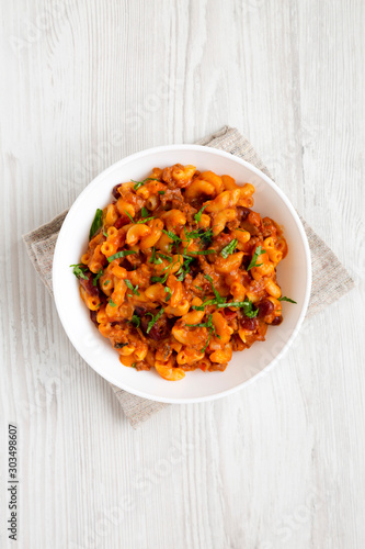 Homemade Chili Mac and Cheese with Parsley in a white bowl over white wooden background, top view. Flat lay, overhead, from above. Closeup.