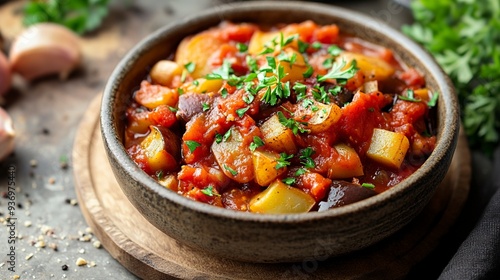 Homemade Eggplant Potato Tomato Stew with Parsley in a Bowl, side view. generative ai