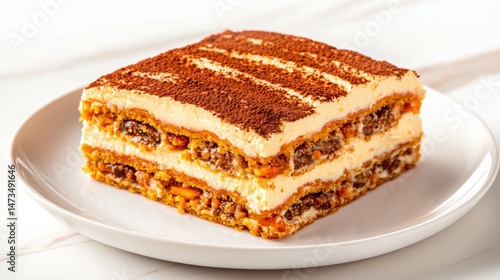 Homemade Food Concept, Delicious layered dessert with creamy filling and chocolate topping served on a white plate.