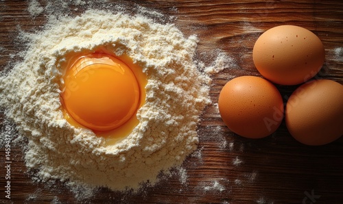 Homemade food prep with raw eggs and flour on moody brown surface flatlay