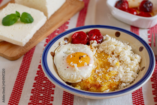 Homemade polenta with fried egg, grilled cherry tomatoes and cheese