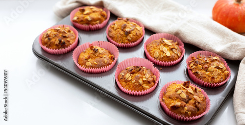 Homemade pumpkin muffins with pumpkin seeds and walnut pieces. Fall baking for Thanksgiving and Halloween. Cupcakes in baking dish on linen napkin. Selective focus. Close up. Copy space