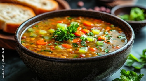 Homemade Vegan Soup with Lentils Carrots and Celery Served with Whole Grain Bread. Generative AI