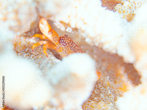 テーブルサンゴに住む美しいアミメサンゴガニ(サンゴガニ科)他。 英名、学名:Honeycomb Coral Crab, Trapezia septata 静岡県伊豆半島賀茂郡南伊豆町中木ヒリゾ浜-2024年