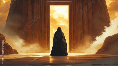 Hooded Figure Approaches A Luminous Gateway In A Desolate Landscape