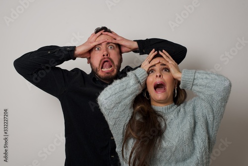 Horrible, stress, shock. Portrait of young emotional crazy woman clasping head in hands. Human emotions, facial expression concept. Trendy colors. Front view