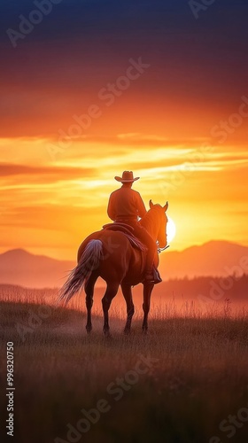 Horse and rider silhouetted against the orange hues of dusk, symbolizing freedom and adventure
