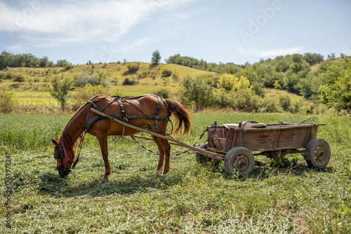 Horse grazing in a green rural field, harnessed to an old wooden cart, displaying a traditional way of life and farming