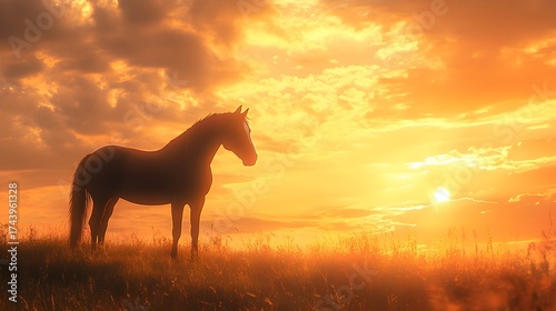 Horse silhouette stands gracefully against a vibrant sunset sky.