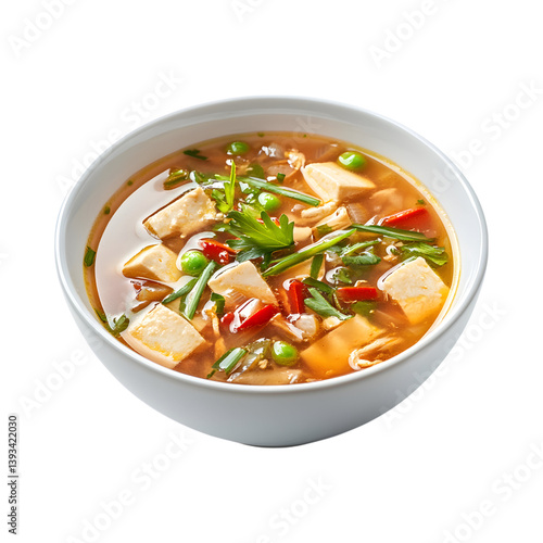 Hot and Sour Soup Bowl with Tofu and Vegetables Isolated on Transparent Background