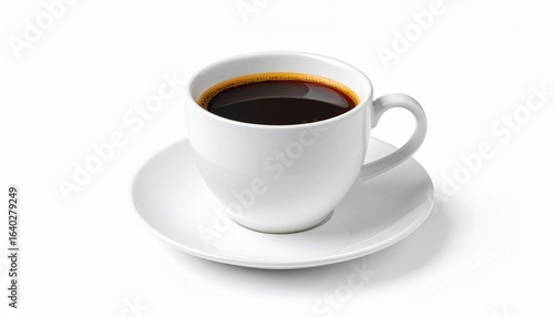 Hot black coffee in a white cup with saucer, isolated on white background, morning beverage concept