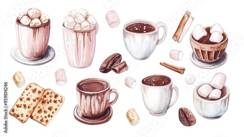 Hot cacao and marshmallows. White background. Watercolor illustrations set