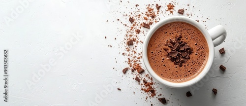 Hot cocoa with chocolate shavings, white background, cozy winter vibes, isolated, minimal design, close-up
