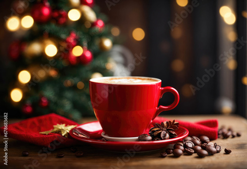 Hot drink with marshmallows . Fir cones, spices in the background. Cozy seasonal holidays