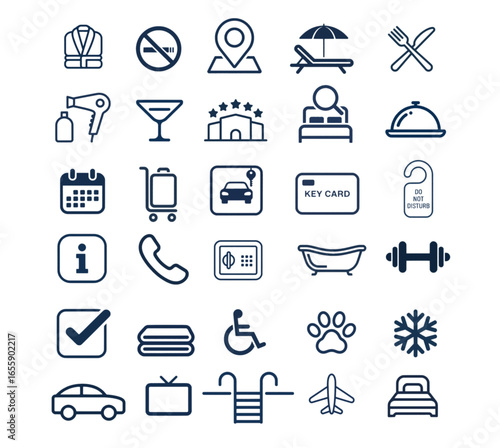 Hotel and tourism vector icon set, a collection of symbols for services like restaurant and parking, and room amenities like bed, safe, and bathrobe, isolated on a transparent background