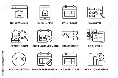 Hotel booking interface icons: website, app, calendar, check-in, reservation tools