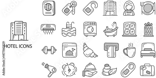 Hotel simple concept 24 hand drawn icons set .Vector illustration.