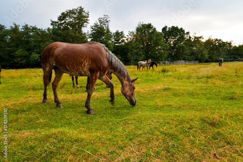 hourses at the meadow with green grass