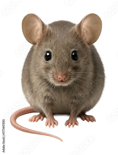 House mouse with big ears, pink tail, and gray-brown fur.