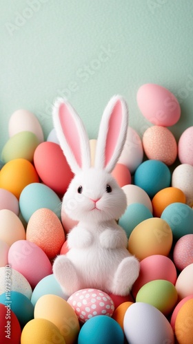 Hovering Easter eggs, fluffy white bunny in the foreground, soft peach background, open yellow space for promotional text.