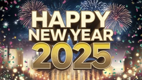 How about Happy New Year 2025 Greeting Card with Fireworks and Stars in a Festive Gold Design?