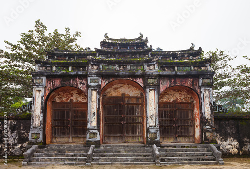 Hue, Vietnam. Dai Hong Mon is a gate with three openings at Imperial Minh Mang Tomb complex. The center gate was opened only once, to admit the body of the Emperor, after gate was closed for ever.
