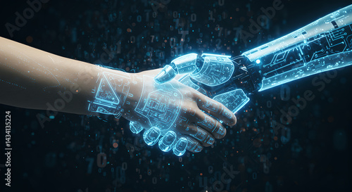 Human and robot hand with digital connect circuit handshake concept. Futuristic partnership between man and machine intelligence. Ai and innovation interface.