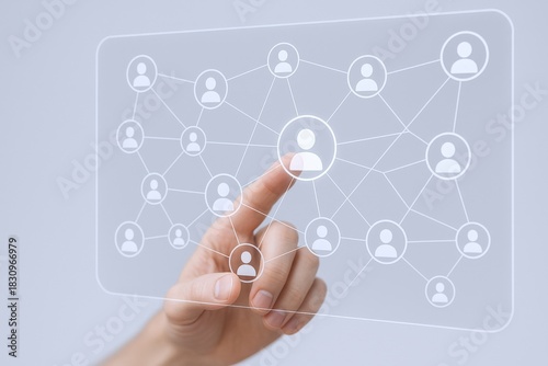 Human Finger Touching Transparent Interactive Screen Displaying a Network of Connected People, Conceptual Technology