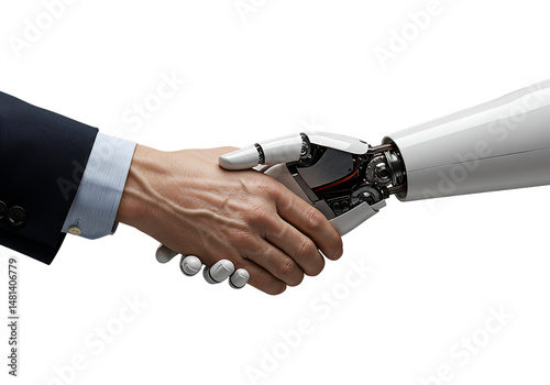 Human hand and robotic arm shake hands representing technology and collaboration