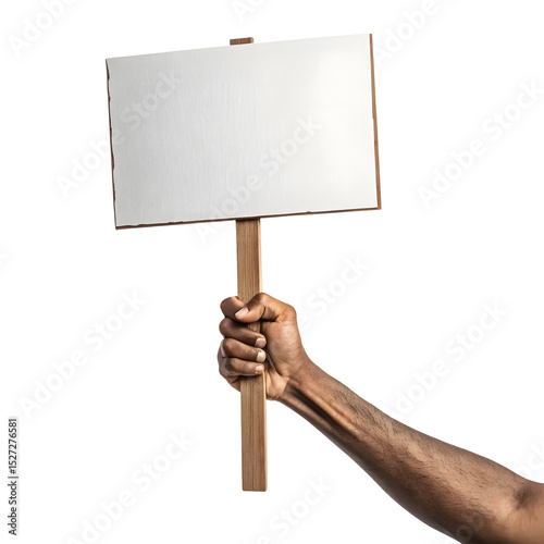 Human hand holding blank demonstration wooden sign isolated on white or transparent background