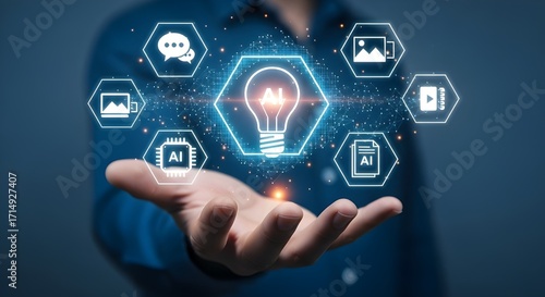 Human hand holding glowing AI technology icons and lightbulb innovation concept Modern and digital technology